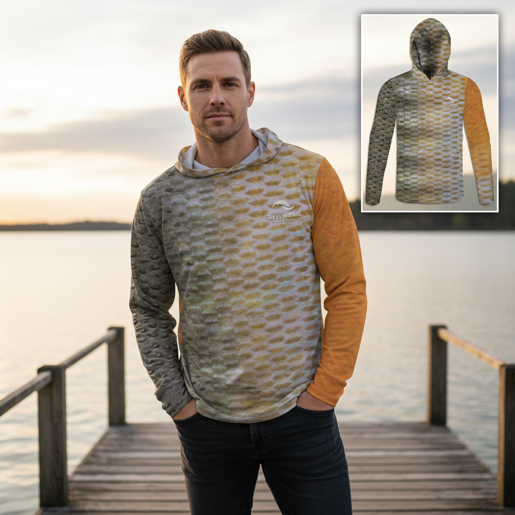 The Bluegill Fish Skin Hoodie is a colorful tribute to the fish that started it all. Featuring a vibrant, all-over bluegill skin pattern with warm oranges, mossy greens, and inky scale accents, this hoodie blends nostalgia with performance in every thread.