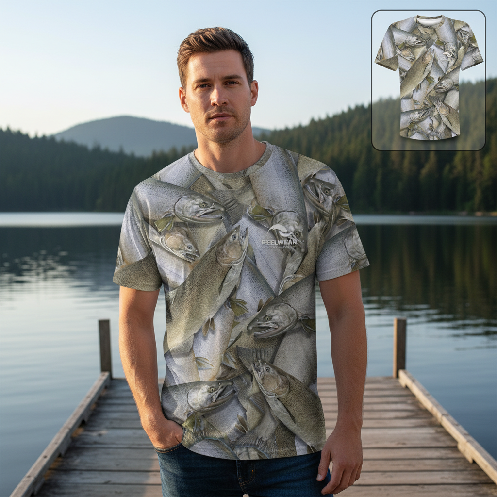 The King Salmon All-Over Print Fishing T-Shirt is built for those who chase giants in wild waters. Featuring full-sized, realistic king salmon wrapped across the front, back, and sleeves, this bold 360° full fish design honors the size, strength, and stunning beauty of the mighty Chinook.