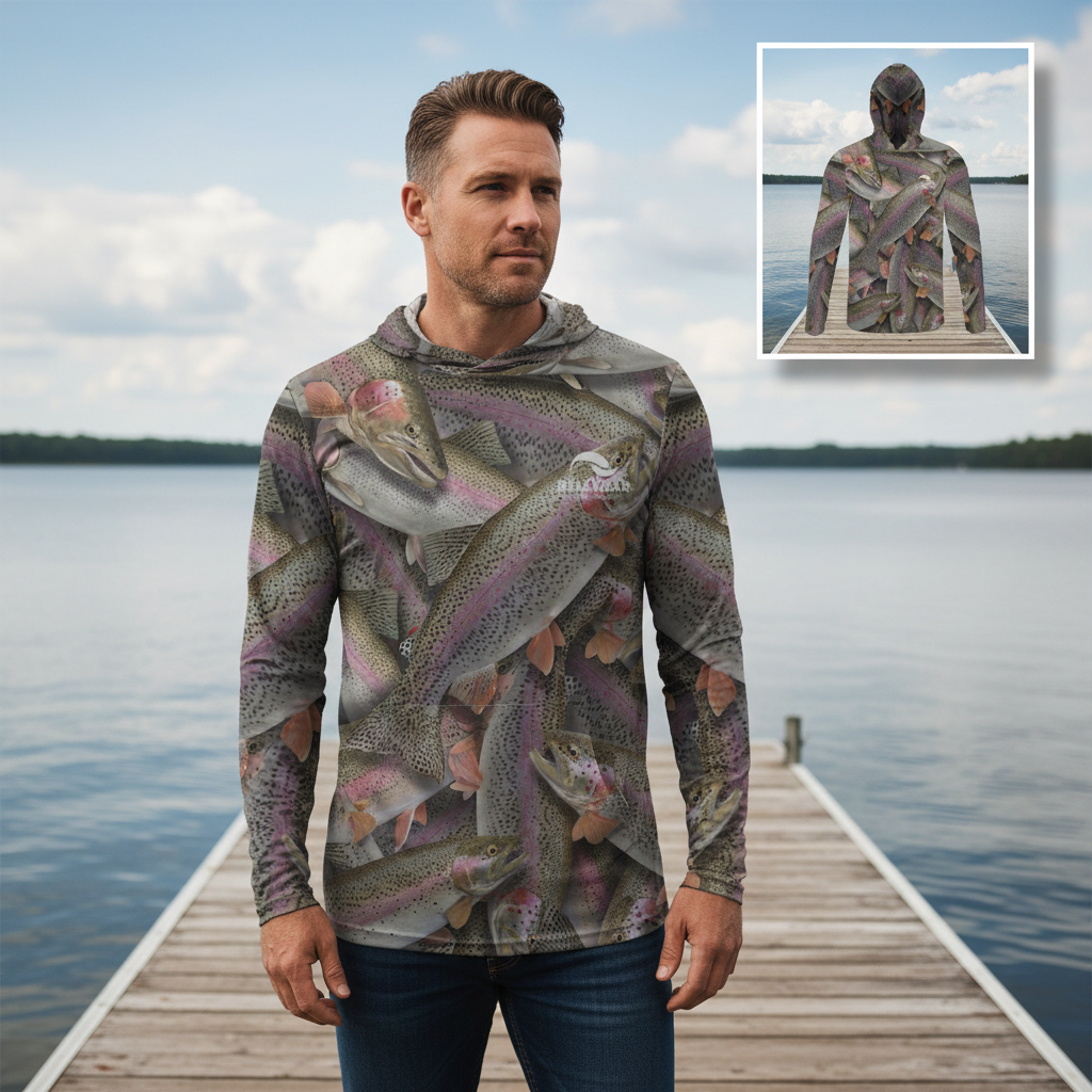 The Rainbow Trout Hoodie is made for anglers who chase vibrant flashes in clear water and feel every tug like a call to wild places. Featuring a bold, realistic full fish wrap of rainbow trout across the front, back, and sleeves, this hoodie celebrates the iconic pink stripe, speckled beauty, and fighting spirit of the rainbow.