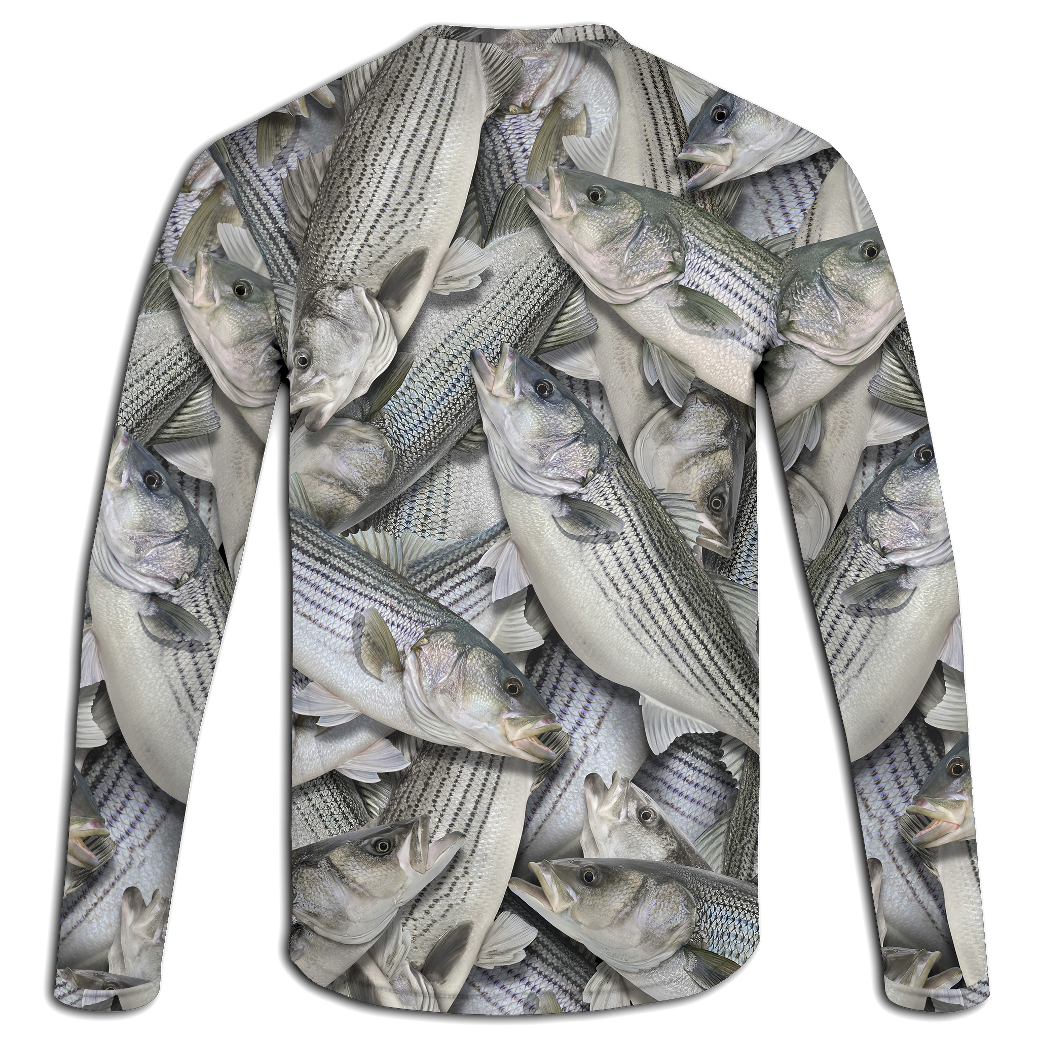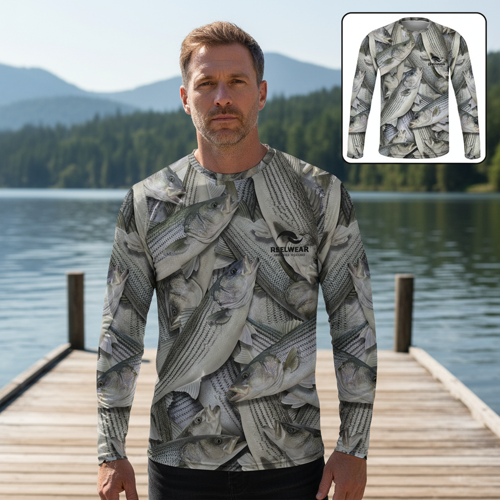 The Striped Bass Long Sleeve Fishing Shirt is for those who chase the run—surfcasting under moonlight, boating river channels, or scanning the horizon for birds. Featuring a full-body, realistic all-over fish wrap of striped bass across the front, back, and sleeves, this shirt captures the clean lines, silver flash, and unmistakable power of one of North America’s most iconic game fish.